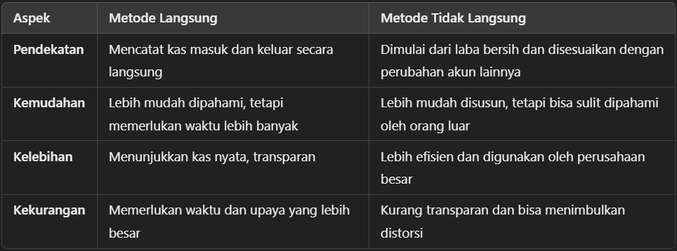 Metode ini memberikan gambaran lebih luas tentang bagaimana laba bersih berhubungan dengan perubahan kas yang sesungguhnya.